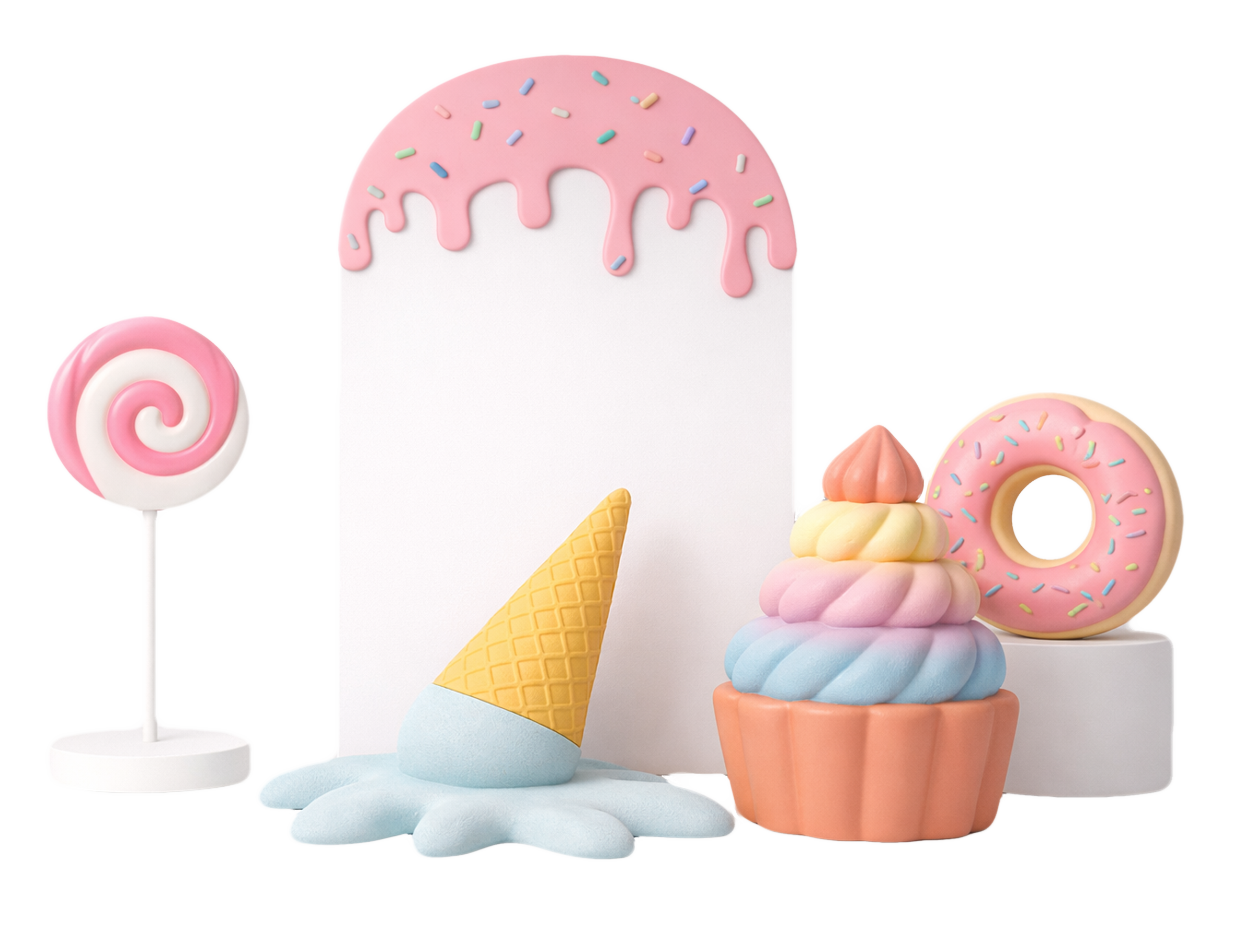 A sculptural, oversized 2-meter backdrop wall featuring a signature "melting" drip design and playful sprinkle accents. Designed to serve as a high-impact vertical anchor, this piece brings a clean, modern, and whimsical aesthetic to sweet-themed event styling. Its grand scale and minimalist shape make it an ideal professional background for curated event scenes.